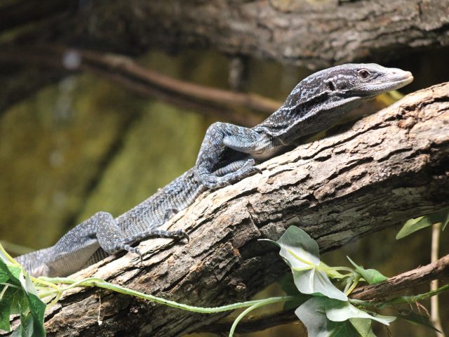 The body of a blue-spotted tree monitor is black, with brilliant blue scales scattered throughout, forming eye-like spots on its back. Their snout is light blue, and their lower jaw is white. Their tail is prehensile and almost twice as long as their body. The largest male monitors can reach lengths of up to 3.5 feet. Despite their size, they are adept at blending in and disappearing into the trees.