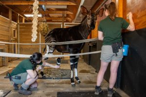 Keepers at Potter Park Zoo use positive reinforcement training to encourage animals to voluntarily present their feet, allowing staff to assess and care for them safely and proactively.