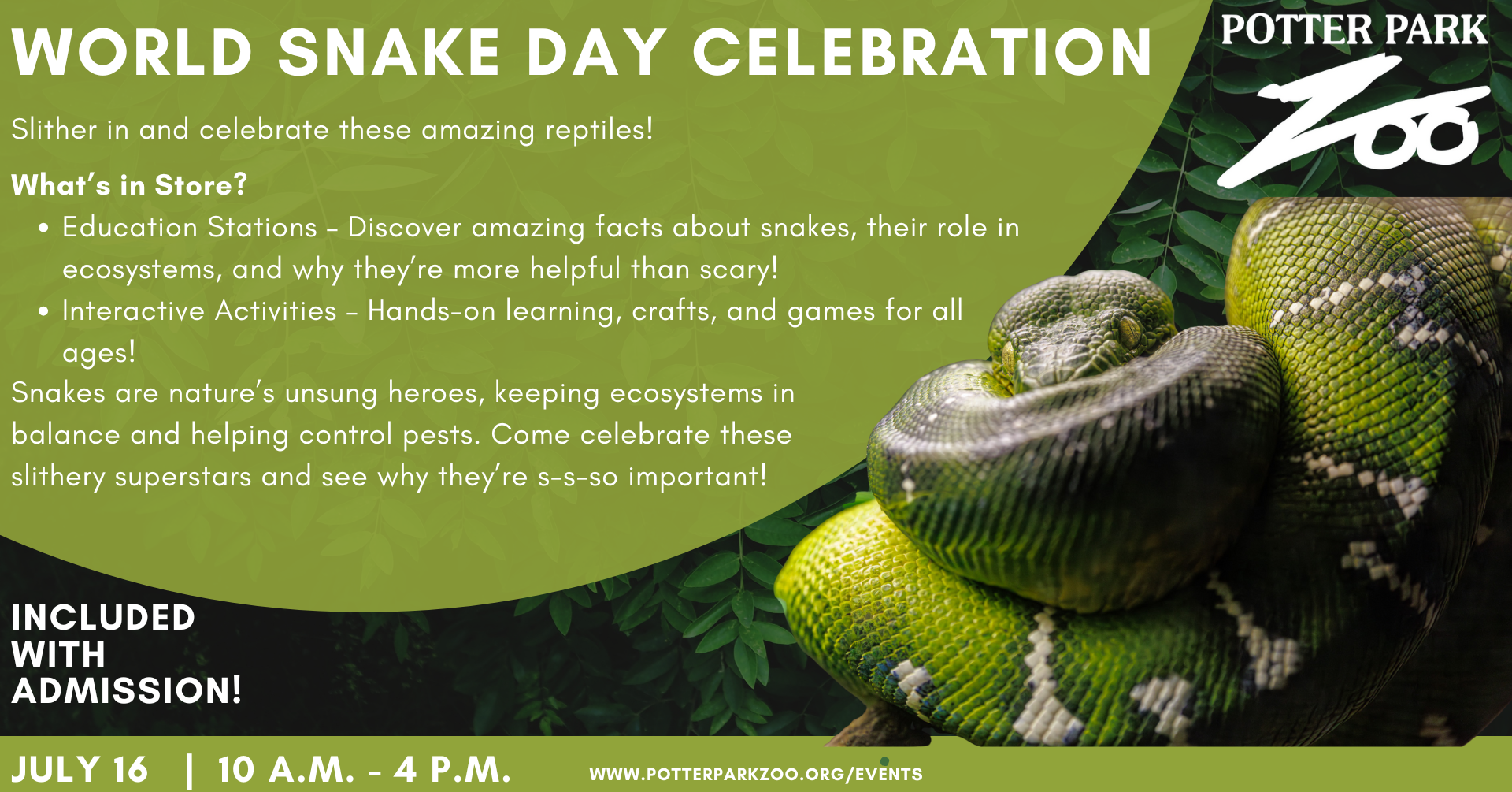 Potter Park Zoo Potter Park Zoo, Lansing, MI, United StatesCelebrate World Snake Day at Potter Park Zoo! Slither into Potter Park Zoo July 16, 2025, for World Snake Day—a celebration of these incredible, misunderstood reptiles! This event is included […]